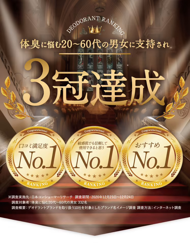 ※1 2018年12月~2019年6月 第一回満足度お声調査結果 ※2 フェースサーベイ株式会社調べ(2019年3月) 黄色ブドウ球菌への殺菌試験 人に対して効果を保証するものではありません。※3 日本コンシューマリサーチ デオドランドブランドイメージ調査(2020年12月)