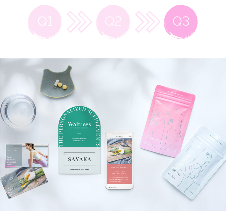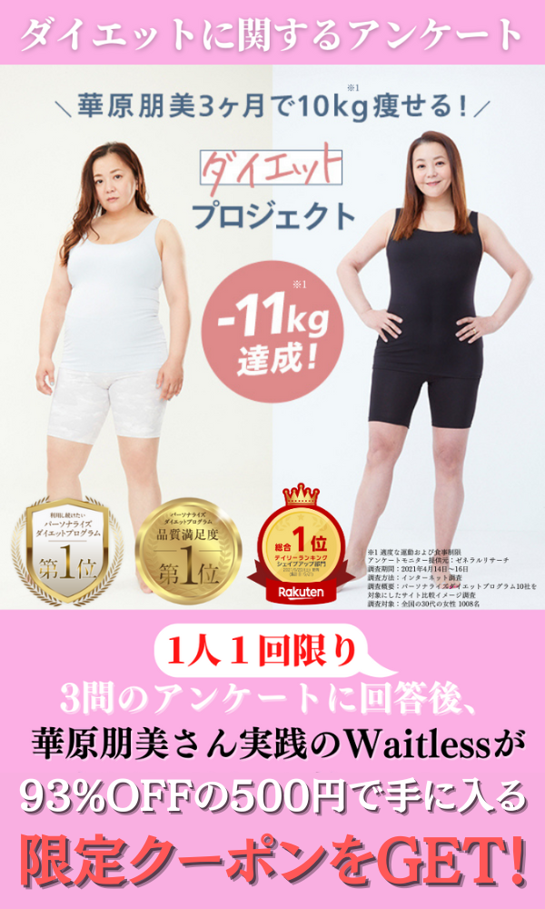 ※1適度な運動および食事制限でWaitlessプログラムを3ヶ月間実施し、確率的に可能な数値は体重:-4.56~5.92kgであり、その最大値(2021年7月TFCラボ調べ)